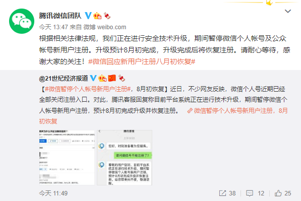 27日13:47,@腾讯微信团队 回应称,根据相关法律法规,我们正在进行安全技术升级,期间暂停微信个人帐号及公众帐号新用户注册。升级预计8月初完成,升级完成后将恢复注册。请耐心等待,感谢大家的关注!
