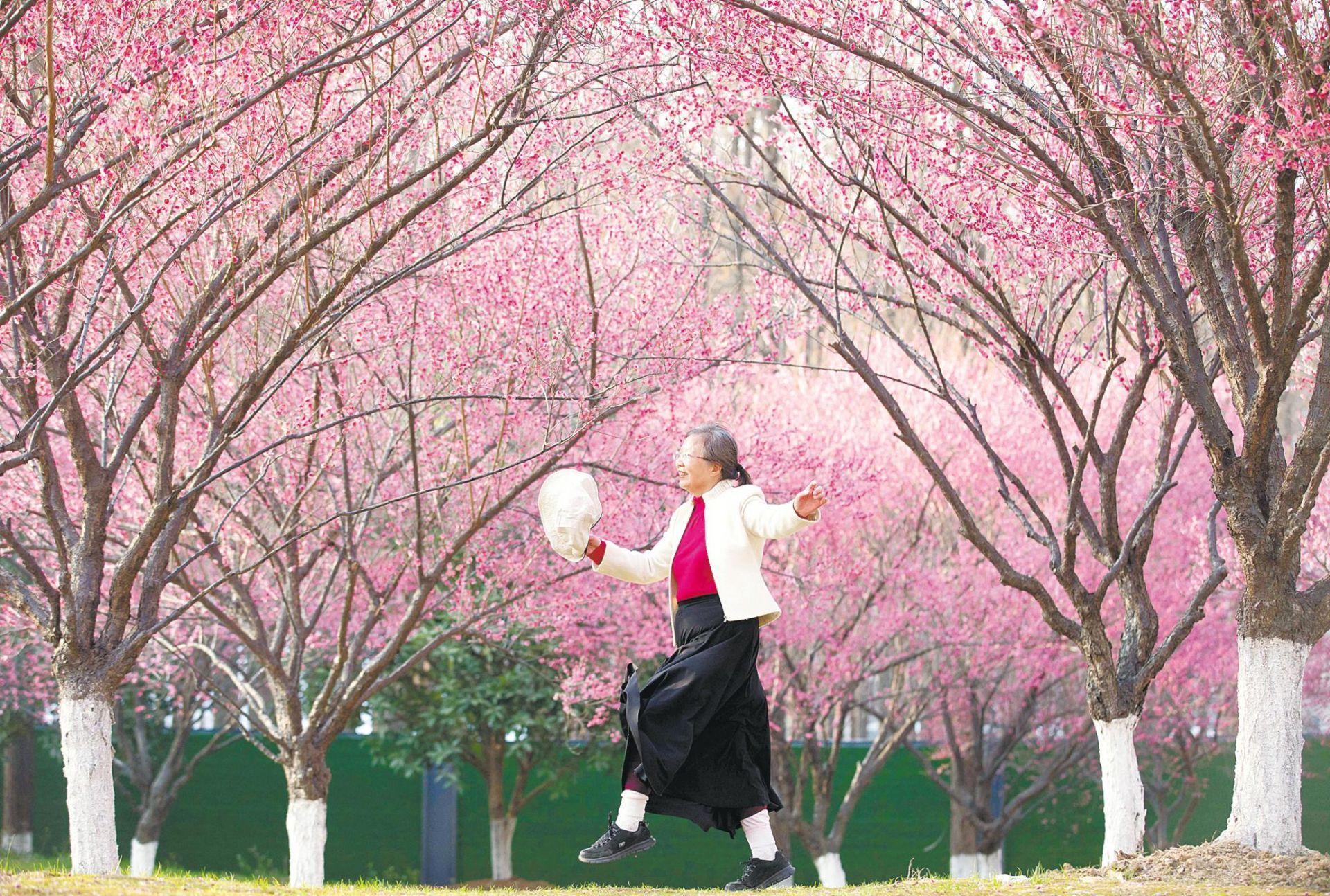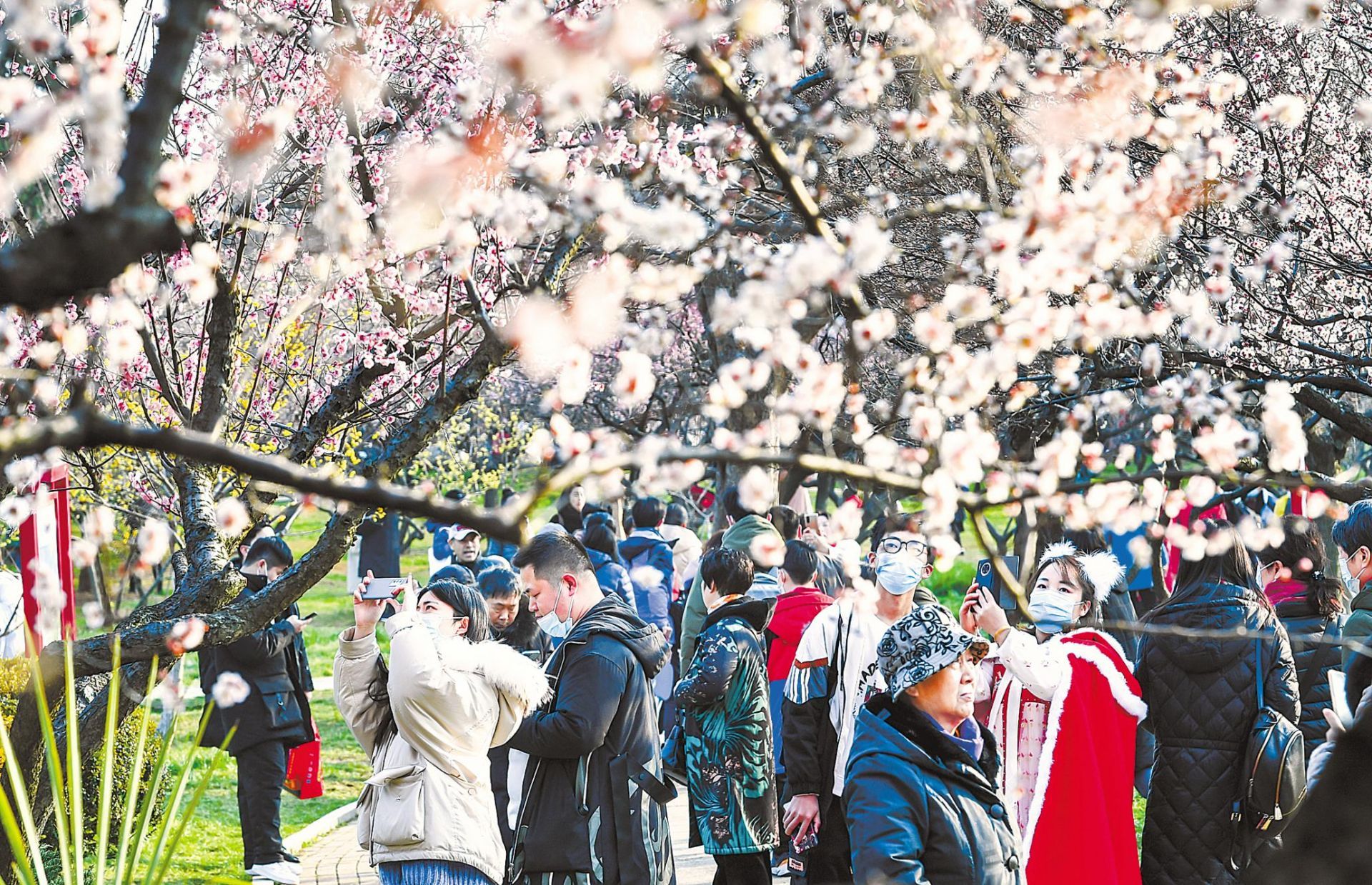 2月25日,武汉江汉区云杉路口,一市民在梅林中乐享春日时光。