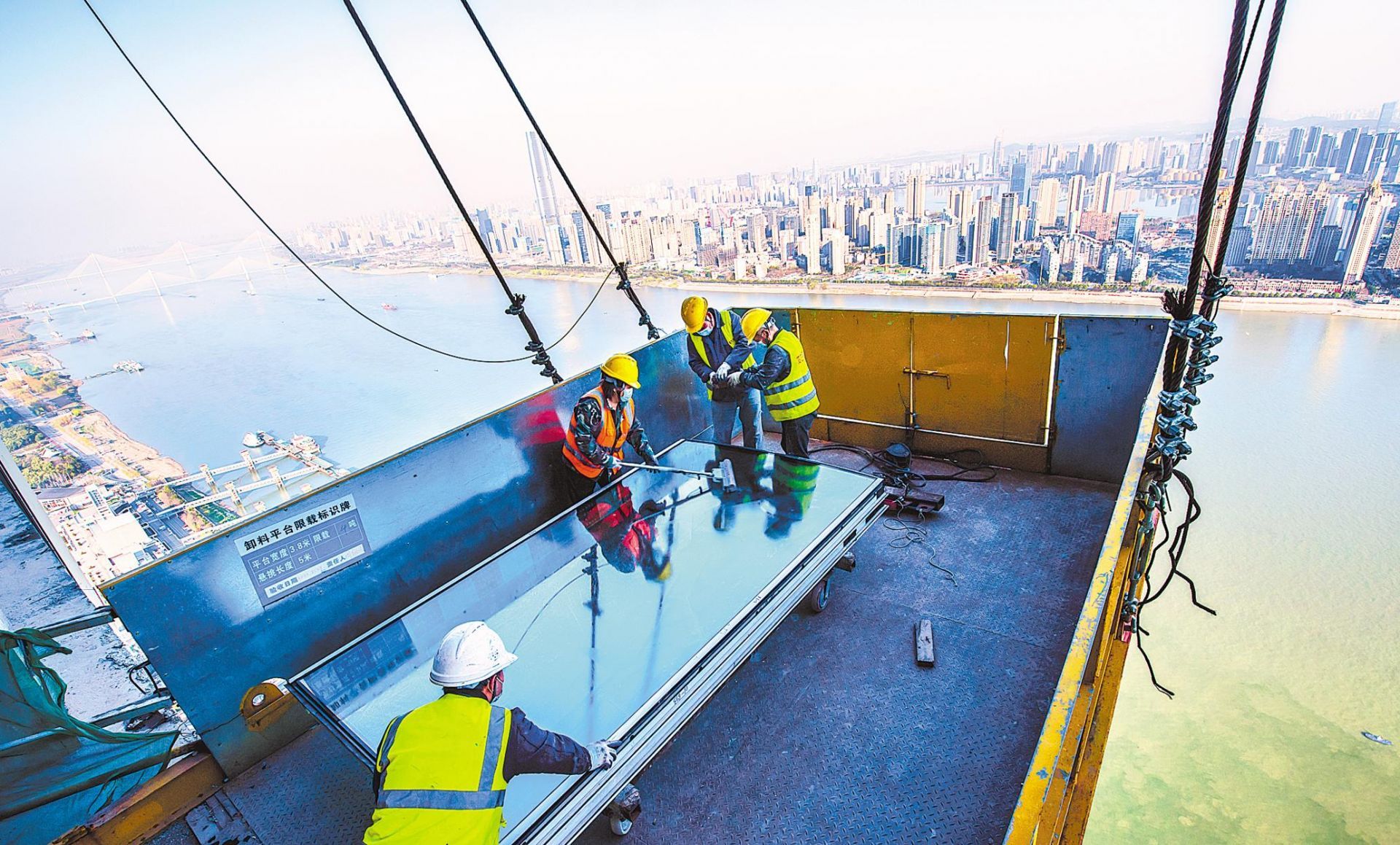 3月9日,武汉长江航运中心约300米高的装卸平台上,施工人员正在准备吊装玻璃幕墙。