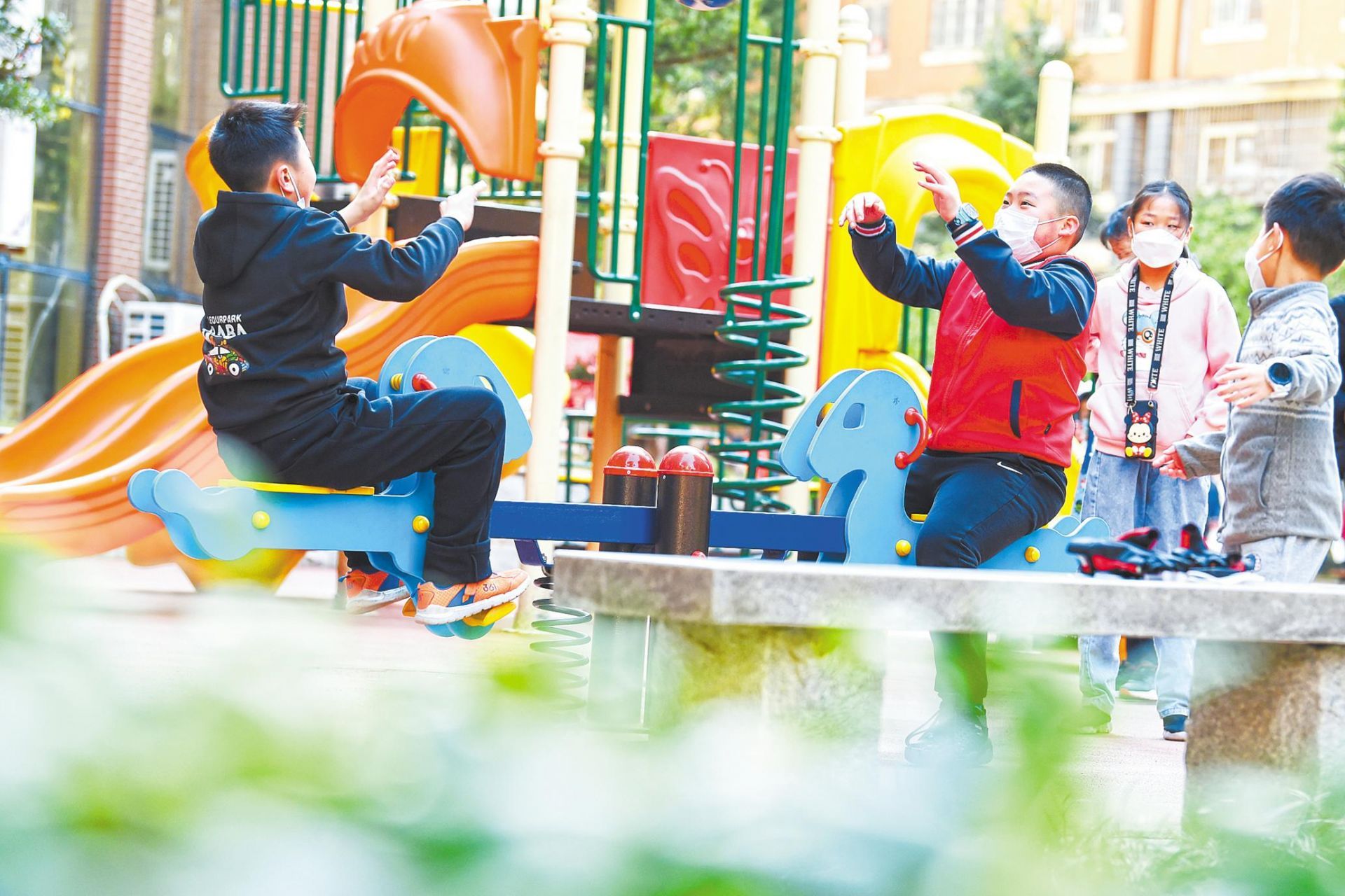 3月9日,武汉东湖新城社区的儿童在小区广场上玩耍。