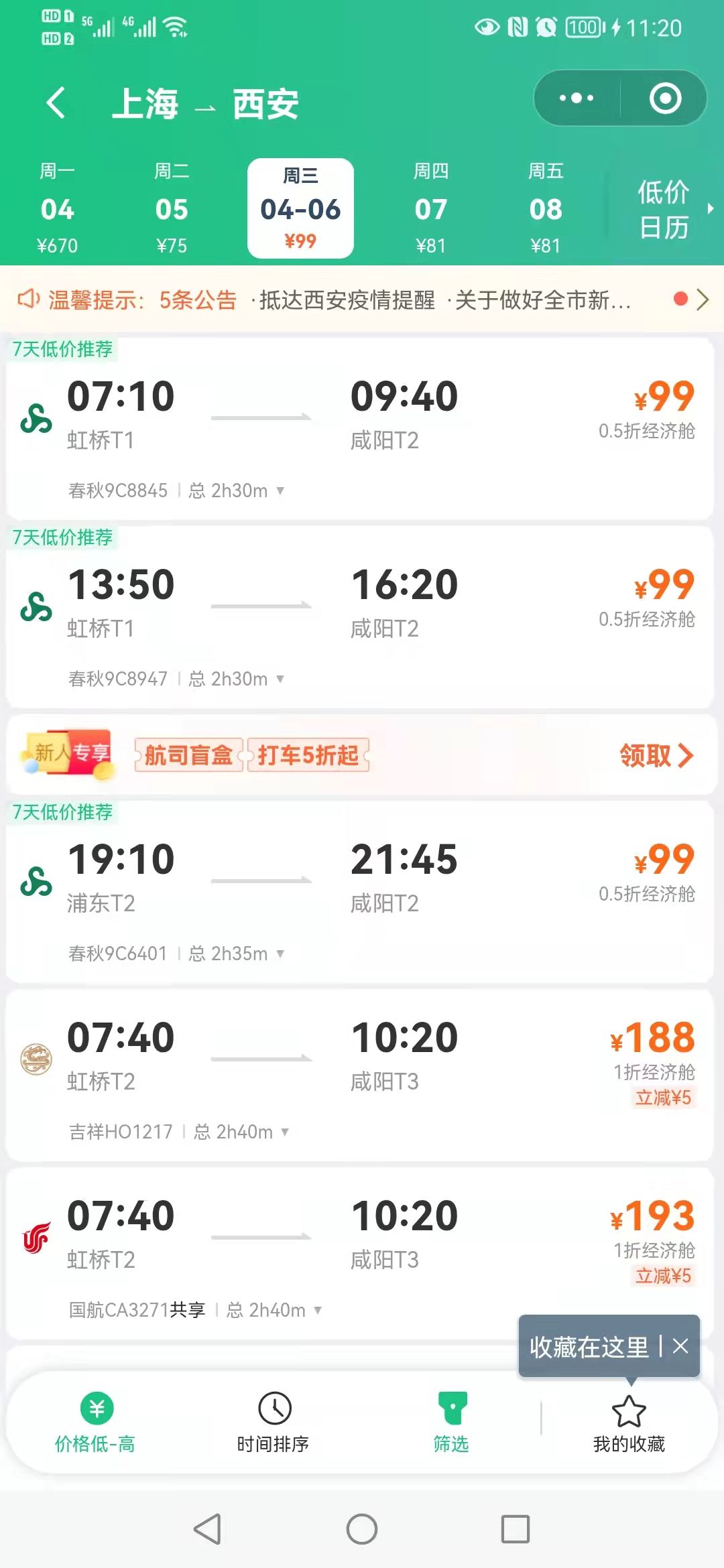 中新财经注意到,目前已经有部分航线的价格已经低于燃油附加费了。例如,4月6日上海到西安,部分航线机票最低价格只有99元。