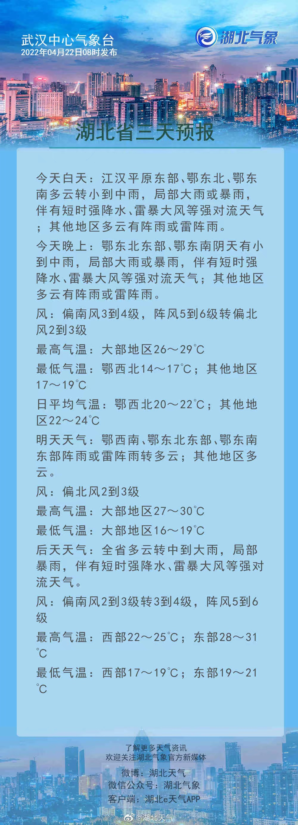 今天夜间,鄂东地区依然有较强降水和强对流天气,其它地区多云有阵雨或雷阵雨。