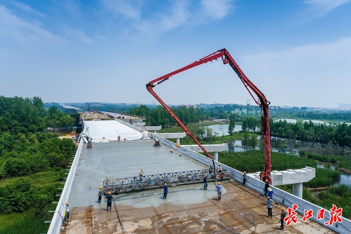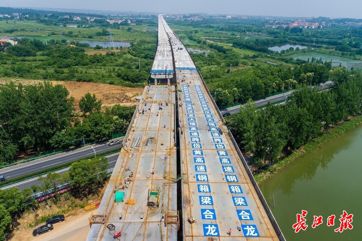 上午,长江日报记者来到武大高速公路施工现场,只见高架桥钢箱梁正在向前顶推,高架桥下面的岱黄高速公路正常运营,车辆川流不息,交通丝毫未受影响。中国一冶武大高速公路二标段项目总工吴慧重介绍,武大高速喻家咀互通前川高架桥全长2.58公里,合龙的第22联箱梁是三跨式变高截面连续钢箱梁,长166.8米,分成三跨,其中主跨75米,是武大高速公路全线跨度最大的钢箱梁。
