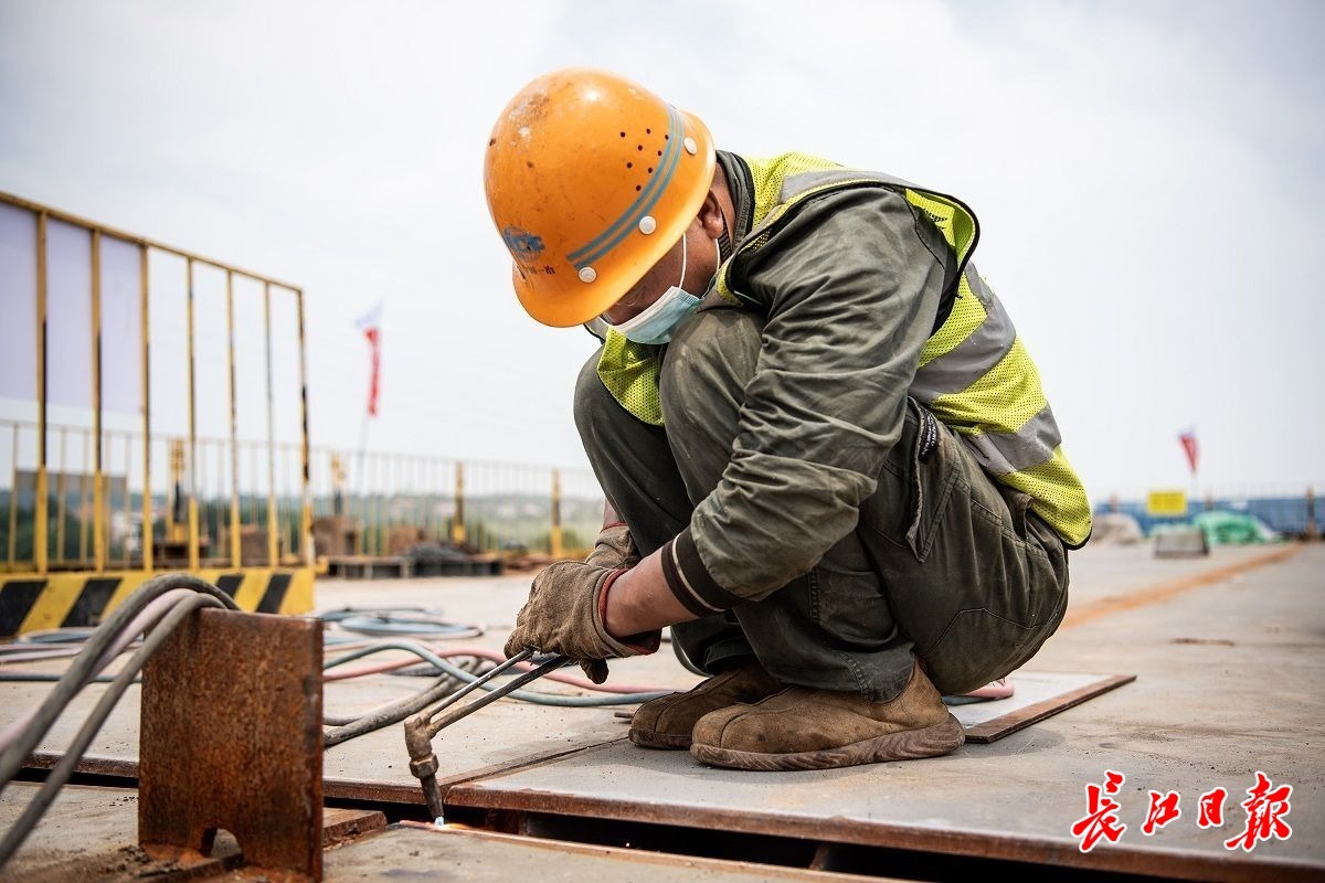 钢箱梁合龙,工人正在焊接。长江日报记者任勇 摄