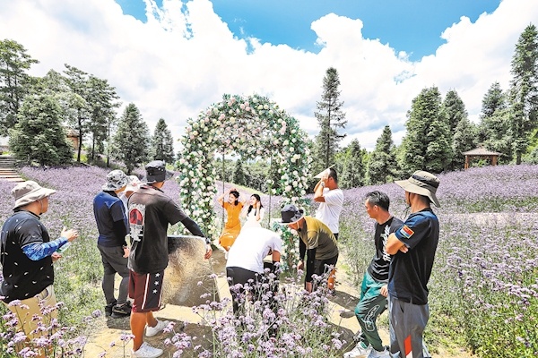 在森林花海景区,各色花卉分布于景区主干道两侧及旅游步道之间,呈现出阶梯式的花田美景,游客们纷纷合影留念。景区相关负责人称,内部还建有七彩滑道、丛林穿越、植物迷宫等游乐项目,入夏以来,每天接待游客2000多人。