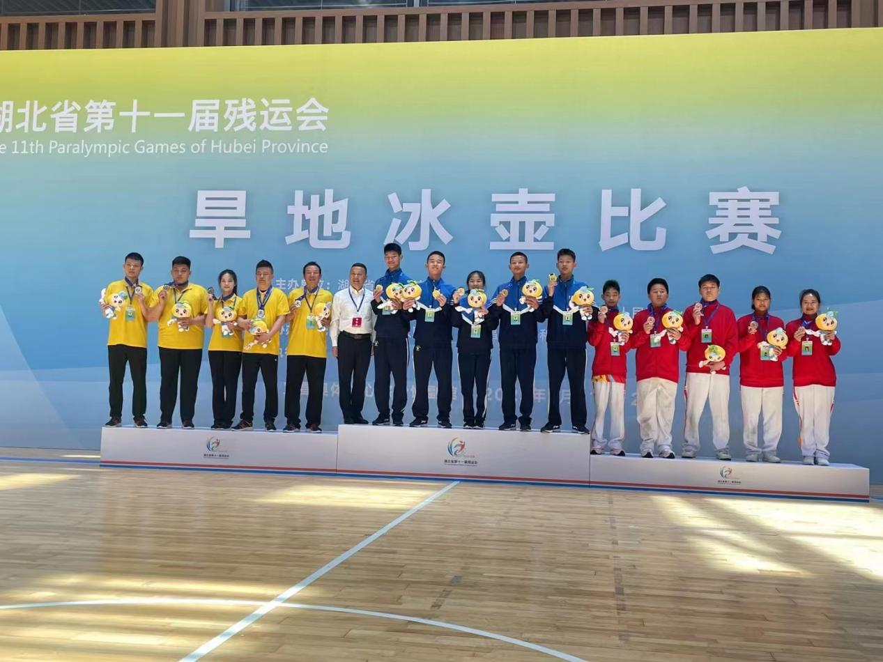 图为孝感市代表队旱地冰壶听力组获得团体冠军的颁奖现场
