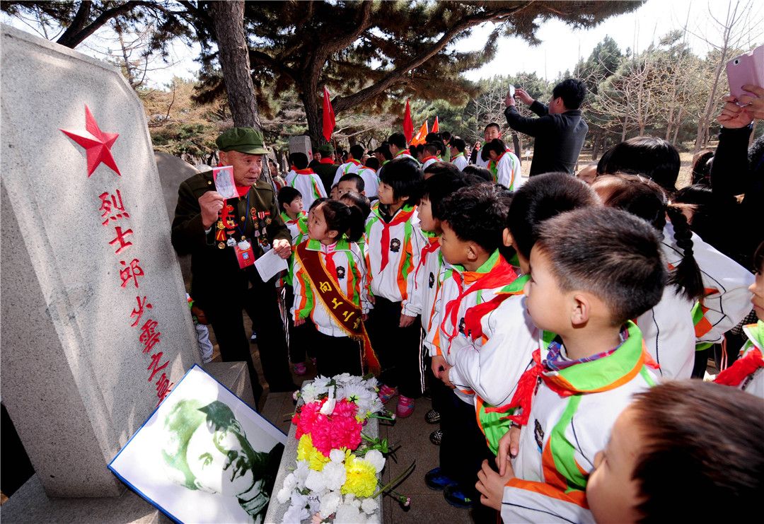 在沈阳抗美援朝烈士陵园,志愿军老战士向学生们讲述邱少云的英雄事迹。张文魁 摄