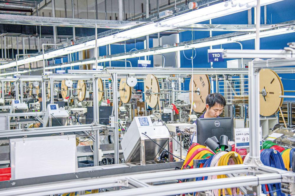 2023年7月27日,在立讯精密电子信息产业园,工作人员在生产线上装配汽车线束。
