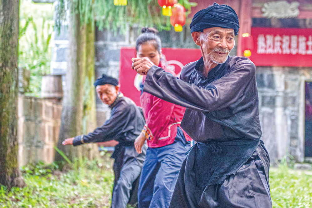 2023年8月18日,舍米湖村村民在表演摆手舞。