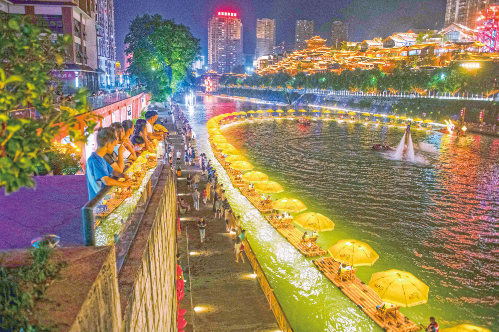2023年8月18日,游客在贡水河边欣赏夜景。