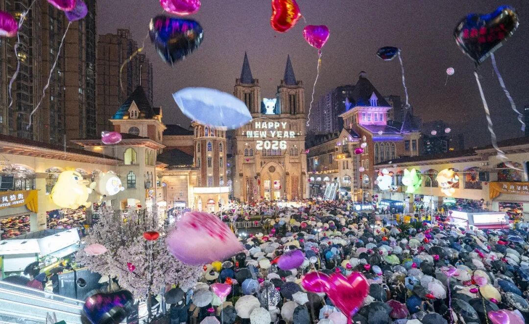 2025年12月31日晚,光谷步行街,市民从四面八方汇聚到一起,共同等待新年的到来。(魏铼|摄)