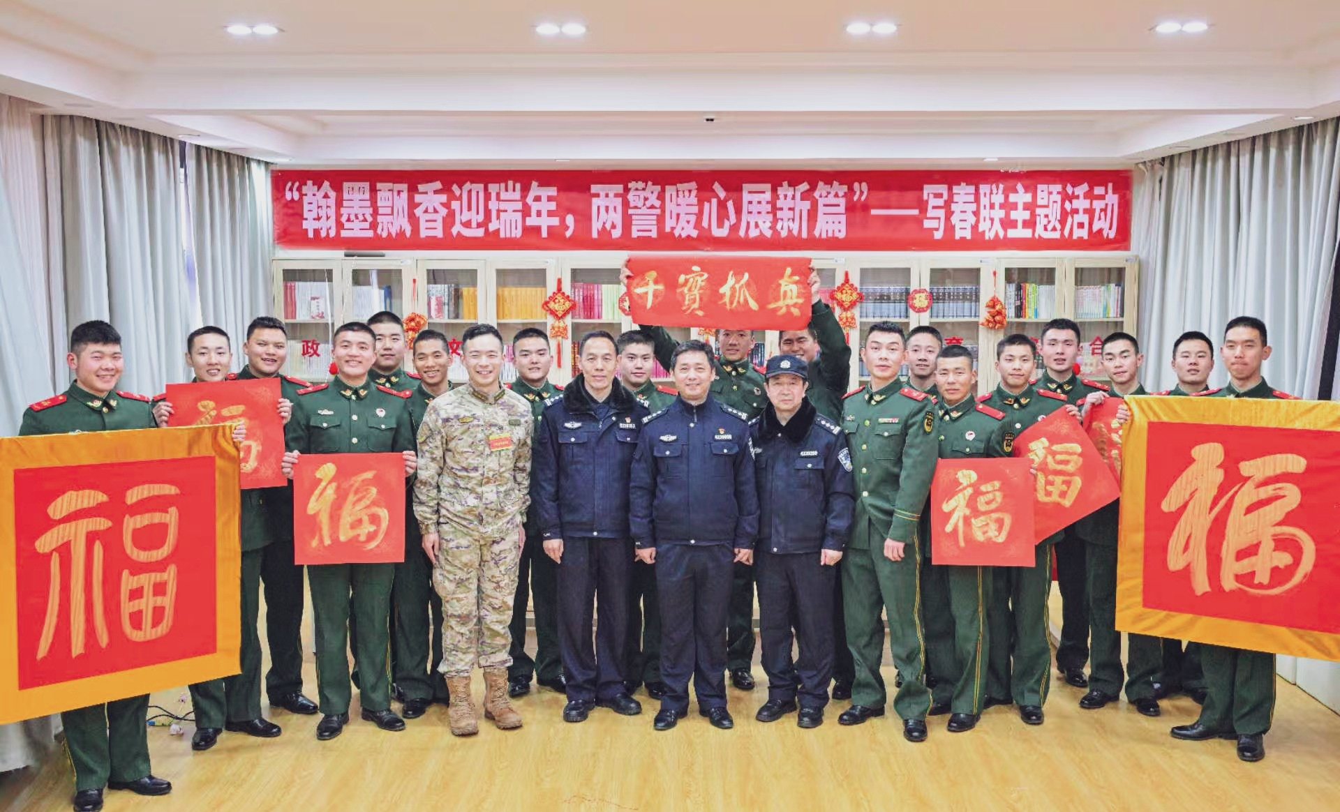 “我想要这幅‘保家卫国守初心,履职尽责担使命’的对联!”“这个金墨写的福字太喜庆了,我要带回宿舍贴上!”书写现场热闹非凡,官兵们纷纷挑选心仪的春联和福字,脸上洋溢着幸福的笑容。活动间隙,监狱领导与武警官兵亲切交谈,详细了解大家的训练、生活情况,感谢他们长期以来为监狱安全稳定作出的重要贡献,双方就进一步深化双警协作、共筑安全防线交换了意见。