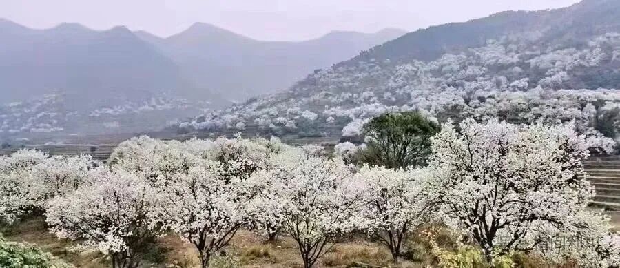 站在山顶俯瞰,千亩李花如雪浪翻涌