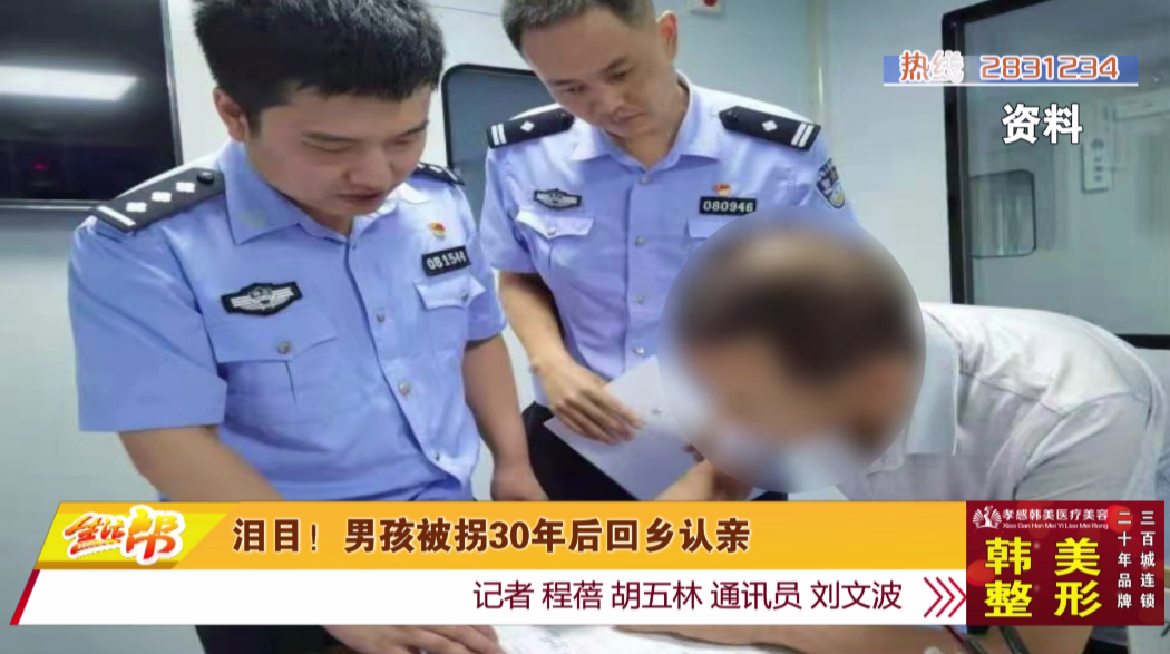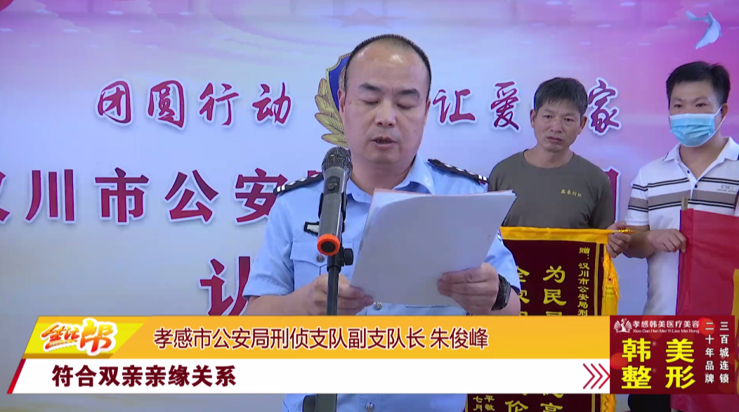 7月22日下午,在汉川市公安局刑警大队举行的“团圆行动·让爱回家”认亲仪式上,今年34岁的宋波从福建泉州赶来,早已等待许久的父母及姐姐、弟弟看到他时,顿时泣不成声,宋波也将父母紧紧抱住,一家人在30年后得以重聚,现场情景令在场人员无不动容。
