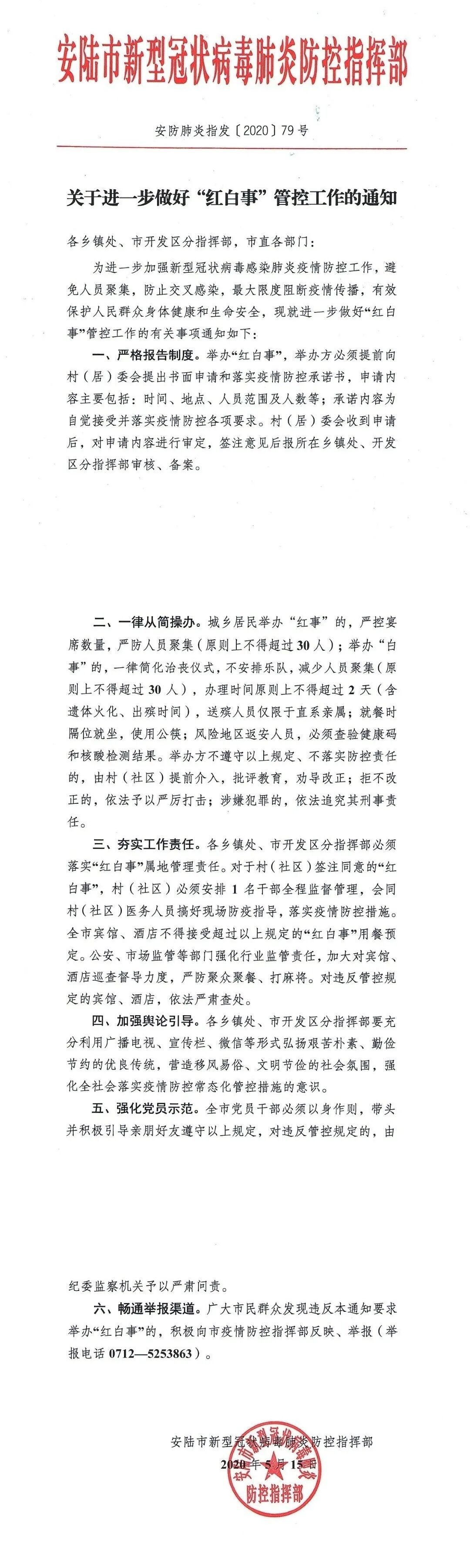 近日,安陆市出台做好“红白事”管控的通知,对宴席人数、办理时间作出限制,如果违规将进行处罚。