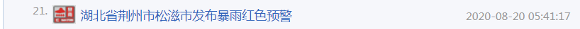 荆州市气象台2020年08月20日05时35分发布暴雨红色预警信号:过去3小时,松滋文家河到洈水一带已经出现60-70毫米降水,预计未来3小时,松滋中西部降水将达100毫米以上,阵风6-8级,伴有雷电,地质灾害、中小河流洪水气象风险高,请注意防范。
