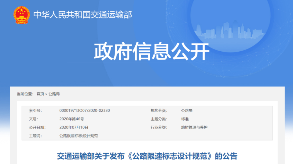 交通运输部发布的《公路限速标志设计规范》详细规定了公路限速路段划分、限速值论证、限速方式选取等内容,该规范将于2020年11月1日起施行。