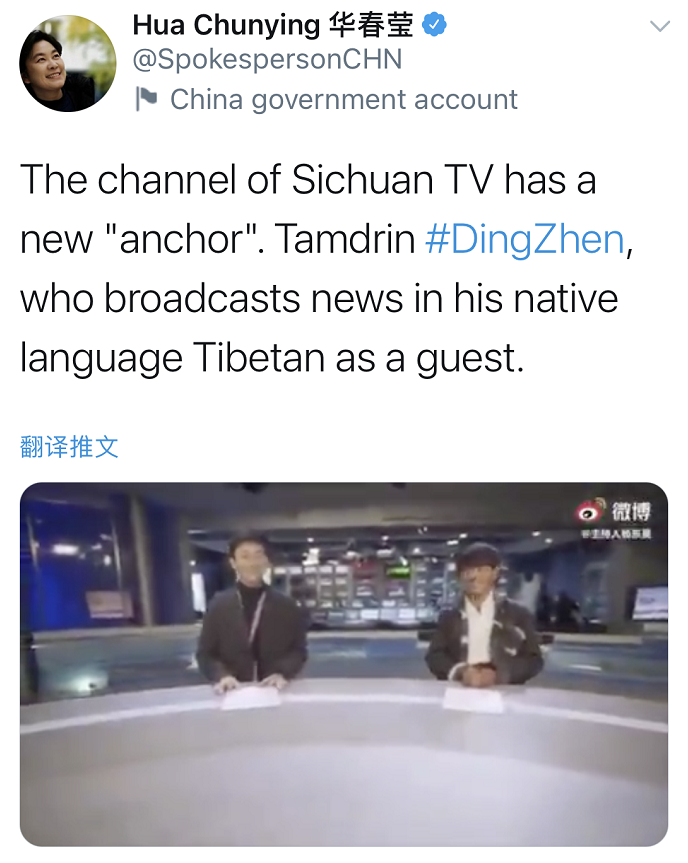 华春莹还介绍了丁真的“新身份”——四川电视台的新“主播”。配图里,丁真做客四川电视台,用藏语播新闻。
