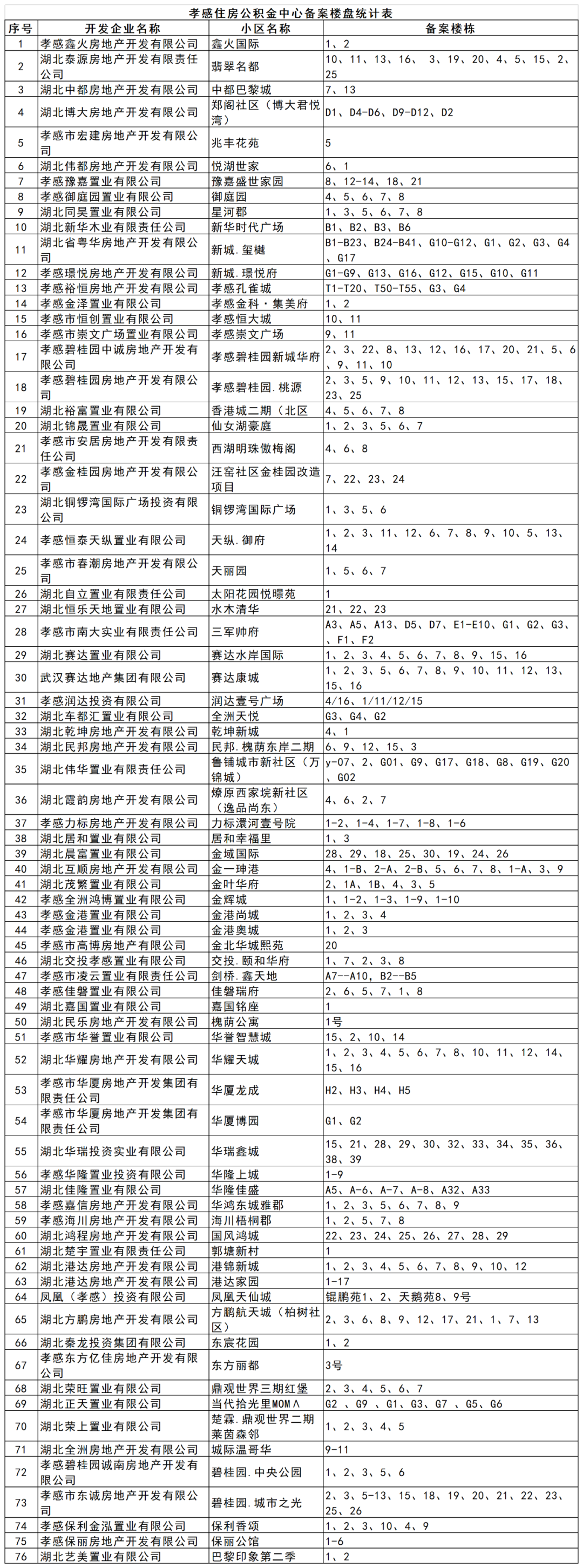 孝感住房公积金中心备案楼盘统计表