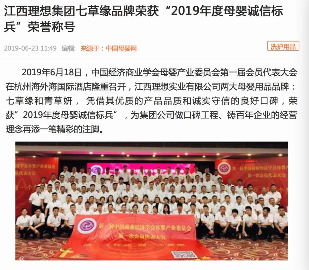 记者查询发现,有网络宣传文章提及江西理想实业的母婴品牌“七草缘”,与青岛男婴家长提及的一款试用装品牌相同。这篇网络宣传文章称,江西理想集团“七草缘”品牌被评为“2019年度母婴诚信标兵”。