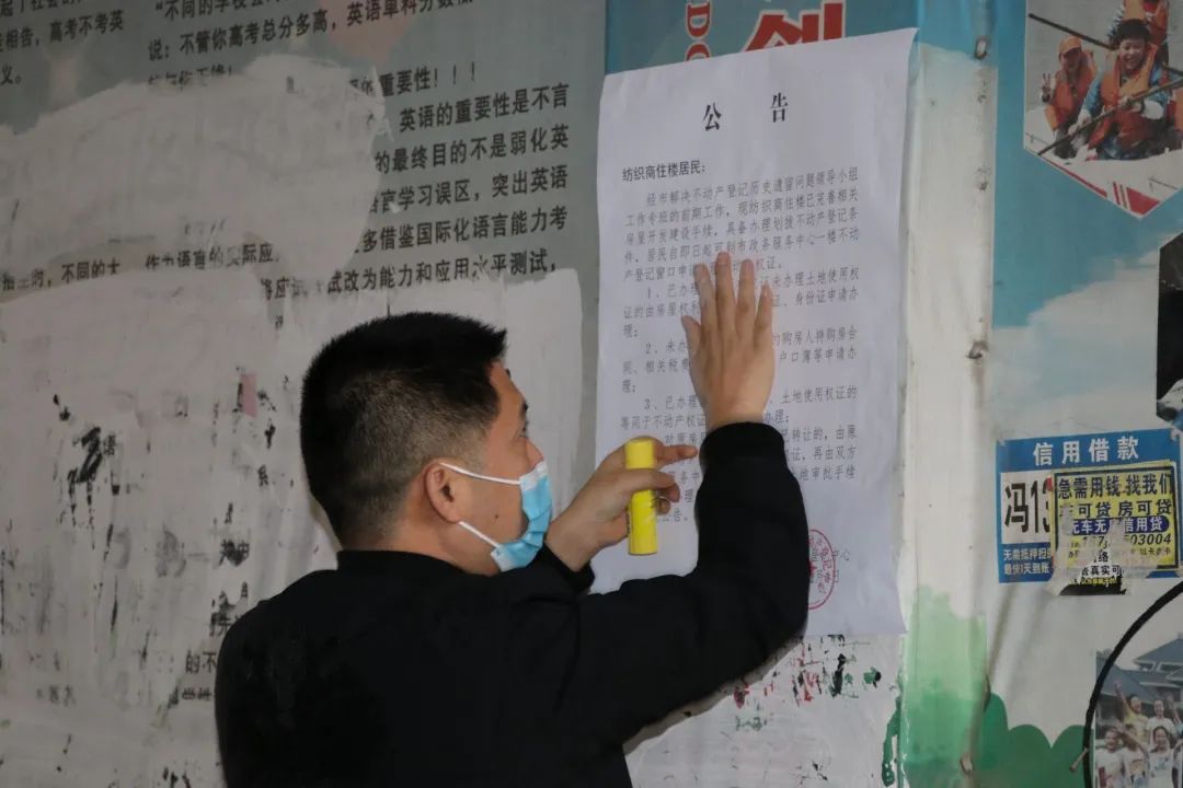 应城市解遗办、市自然资源和规划局、市住建局、市城管局协同光明、月圆等社区工作人员,深入纺织商住楼、富华佳苑东区等四个小区张贴公告,与群众面对面解读政策、解疑答惑,动员群众积极办理不动产权证。