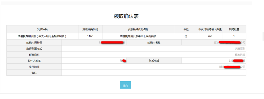 第六步:选择领票方式后,点击下一步,进入发票领用信息确认页面,如下图所示领取确认表页面: