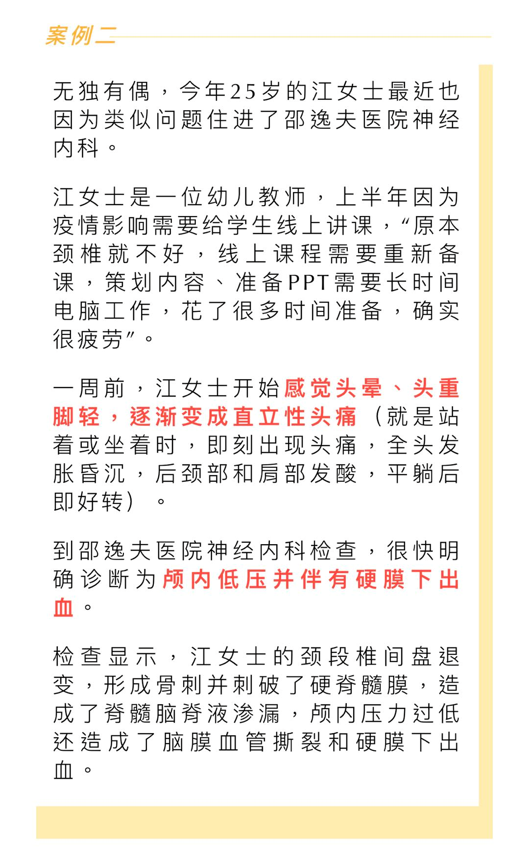 此前,浙江大学医学院附属邵逸夫医院神经内科曾接连接诊了两个年轻的“低头族”,长时间低头用电脑、玩手机而头痛难忍。经医院检查显示,患者颈段椎间盘退变,形成骨刺并刺破了硬脊髓膜,造成了脊髓脑脊液渗漏,颅内压力过低还造成了脑膜血管撕裂和硬膜下出血。