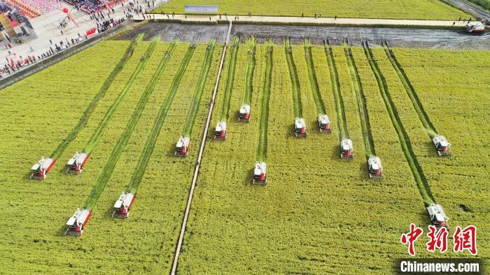 资料图:佳木斯富锦市万亩稻田秋收场景。陈志伟 摄