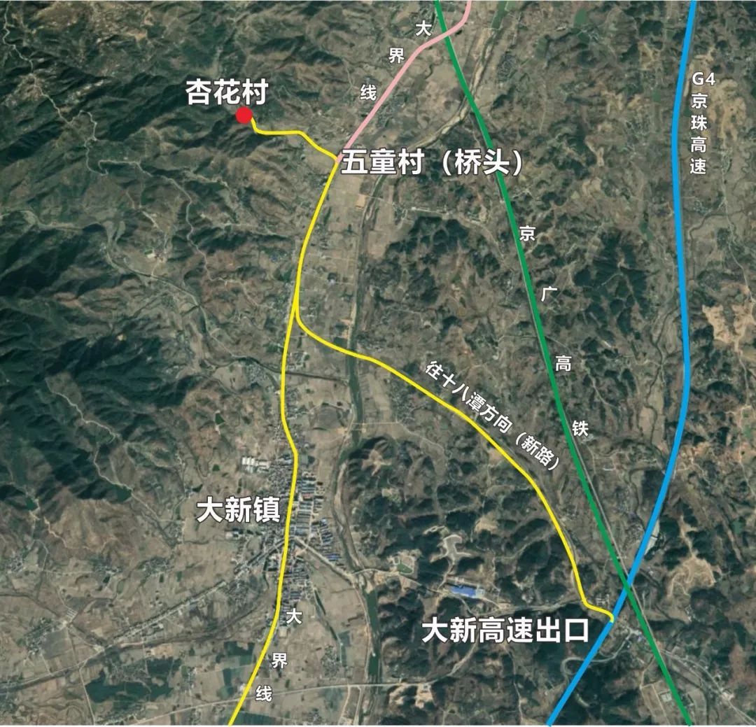 大悟城区 → 大新镇 → 五童村桥头(大新往三里方向左手边)→ 顺小河上约三公里