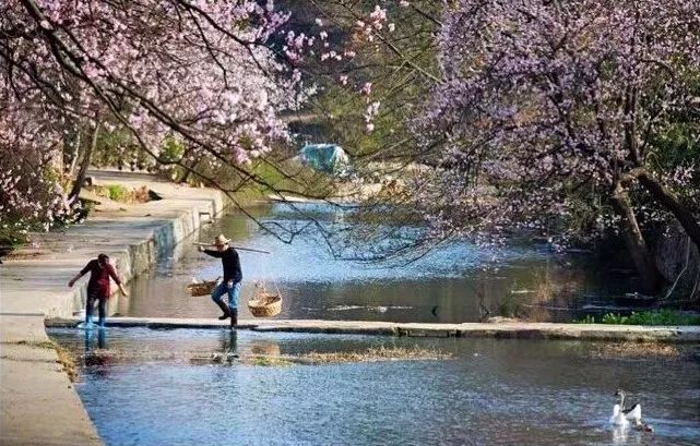 河岸上杨柳婆娑,桃杏红艳,李梨洁白,
