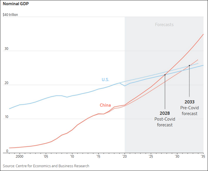 中(红色)美(蓝色)两国GDP预测曲线(阴影处虚线为疫情前预测,阴影处实线为疫情后预测)。图自《华尔街日报》“中国经济在疫情期间的优异表现,将使得(中美之间)差距缩小。”瑞银集团(UBS)董事长韦伯(Axel Weber)今年年初就表示,基于IMF的数据,他认为中国经济达到和美国同等体量的预期时间,会由先前的2030年提前至2028年。而总部位于伦敦的研究机构“经济与商业研究中心”(CEBR),同样也认为这一天会提前至2028年到来,此前,该机构的这一预测结论已在去年底被美国彭博社第一时间报道。