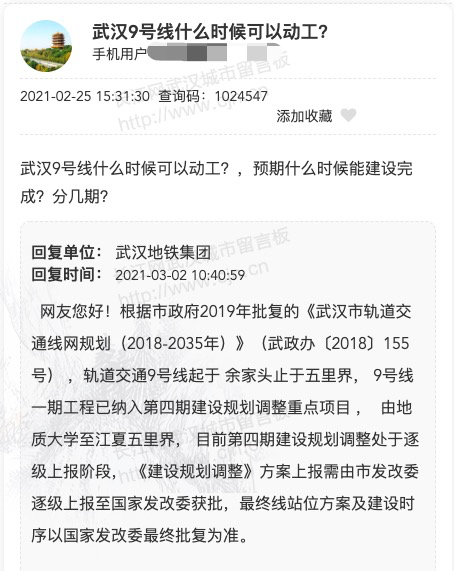 据武汉地铁在长江网武汉城市留言板回复