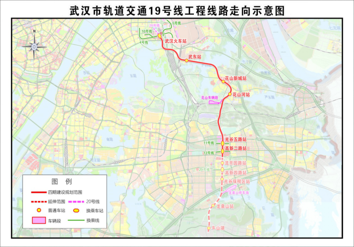 武汉地铁19号线起于武汉火车站,途经武东路、花城大道、花山大道、光谷五路,串联杨春湖副中心、青山区武东、花山生态城、光谷中心城,止于高新二路站,线路全长约21.2公里,现有车站6座,全为地下站。