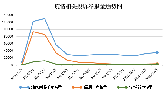 疫情发生以来,相关投诉举报主要集中在口罩、蔬菜等方面,全国市场监管部门迅速开展专项行动,共查核71.81万件疫情相关投诉举报,为消费者挽回经济损失9159.20万元;立案14.16万件,罚没金额1.23亿元。下半年以来,随着打击价格违法、假冒伪劣、野生动物非法交易各项措施力度加大,公众投诉举报数量逐步减少,与峰值日相比,相关投诉举报日接收量下降94%、口罩下降99%、蔬菜下降97%,相关物资假冒伪劣、价格等问题下降86%、99%,违法行为得到遏制,市场秩序逐步趋于稳定。