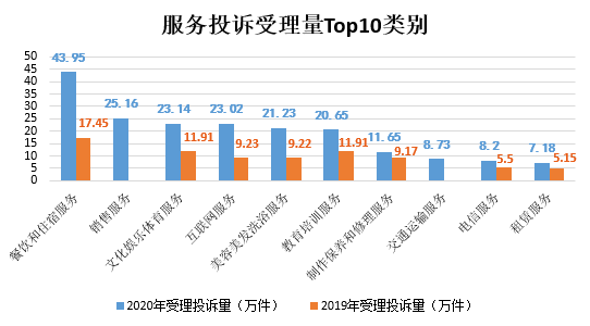 服务投诉排名靠前的是:餐饮和住宿服务43.95万件,销售服务25.16万件,文化娱乐体育服务23.14万件,互联网服务23.02万件,美容美发洗浴服务21.23万件。