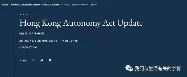 美国国务卿布林肯今日发布了一个所谓的《香港自治法》更新内容。