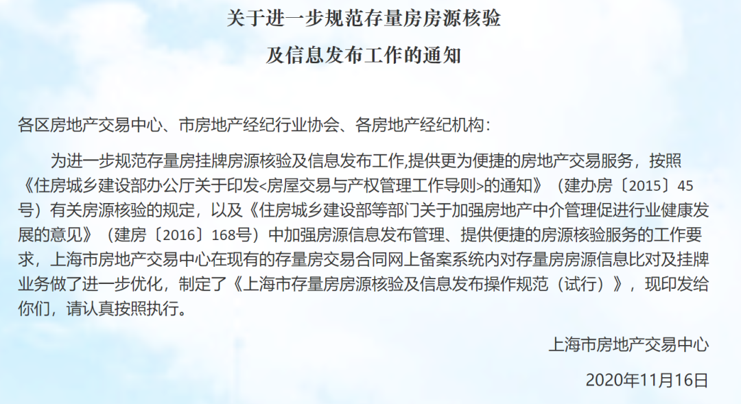 此前上海市房地产交易中心下发了《关于进一步规范存量房房源核验及信息发布工作的通知》及《上海市存量房房源核验及信息发布操作规范(试行)》。
