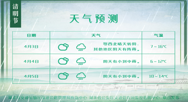 根据最新气象资料分析,预计今年清明节期间(4月3—5日)湖北以阴雨天气为主,其中4—5日受冷空气影响,全省有较明显降温,伴有小到中雨,具体预报如下: