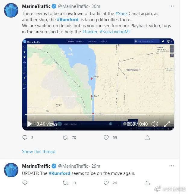 悬挂巴拿马国旗的重型货轮“长赐”号3月23日在苏伊士运河新航道搁浅,造成航道堵塞。经过连续数天救援后,搁浅货轮3月29日成功起浮脱浅,目前仍停留在苏伊士运河的泊位中。埃及方面和货轮管理方正对事故原因进行调查。