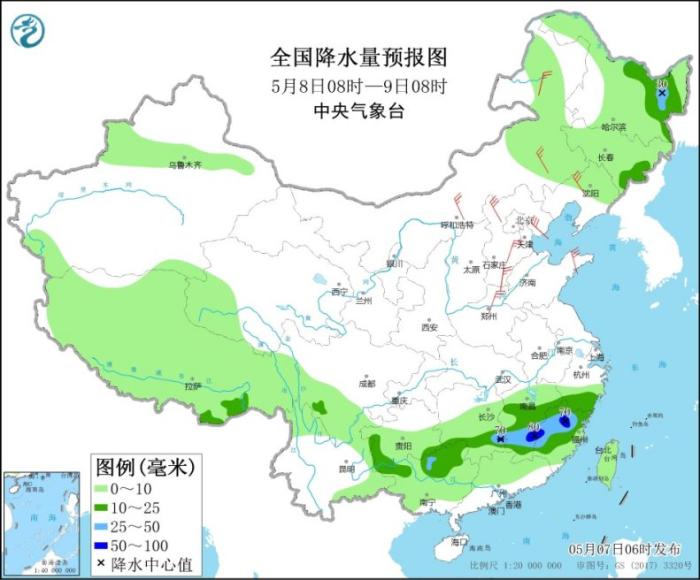 全国降水量预报图(5月7日8时-8日8时)