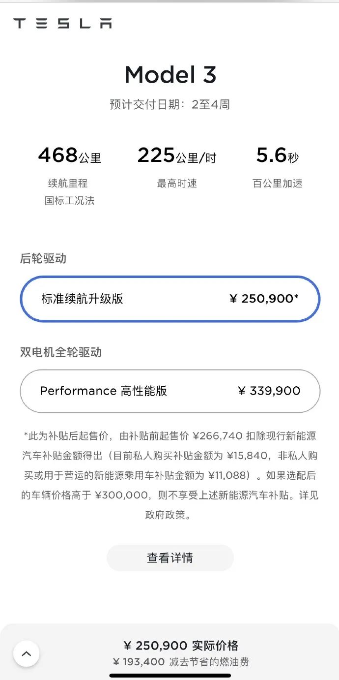 上调之前,标准续航升级版Model 3在国内市场补贴之前的起售价为26.57万元,上调之后为26.67万元。扣除1.58万元补贴之后,私人购买起售价为25.09万元;非私人购买补贴为1.11万元,起售价为25.57万元。