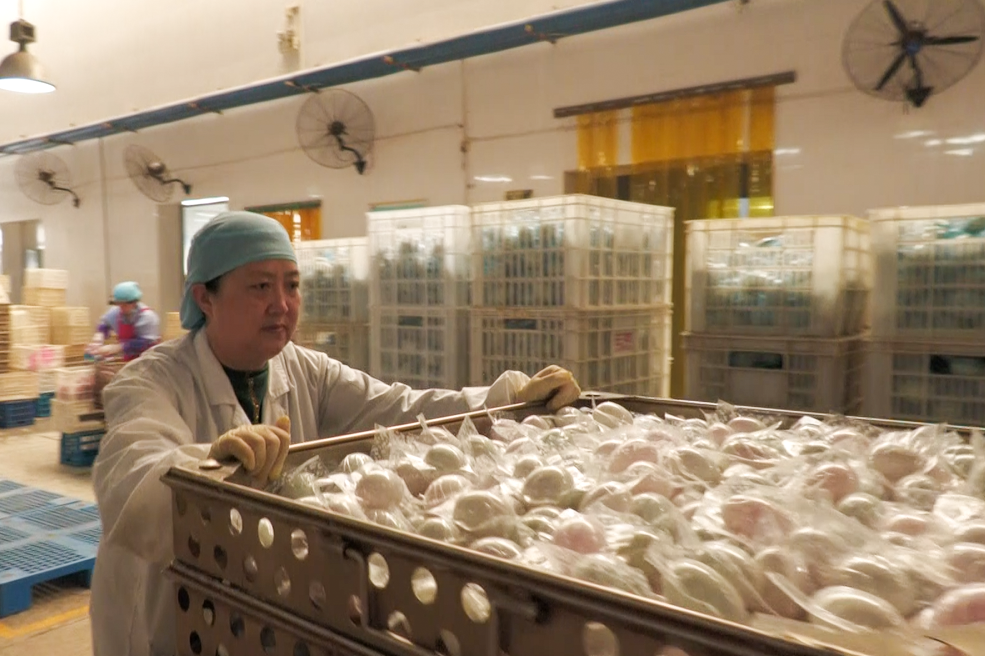 为了提高生产效率,降低生产成本,万秋菊研究改进了连续真空机生产设备,经过反复试验安装了双层且可转弯输送线,直接将咸蛋生产从腌制清洗---照检---消毒---真空---杀菌连成自动流水线,使咸蛋真空日产量从20万枚提升到100万枚。