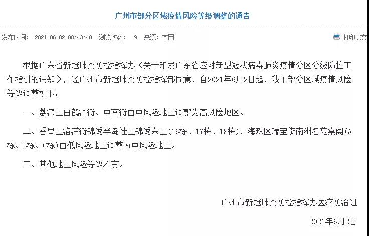 根据广东省新冠肺炎防控指挥办《关于印发广东省应对新型冠状病毒肺炎疫情分区分级防控工作指引的通知》,经广州市新冠肺炎防控指挥部同意,自2021年6月2日起,我市部分区域疫情风险等级调整如下: