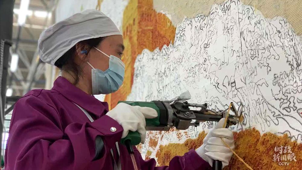 △这幅手工枪刺藏毯以长城为原型,面积接近14平方米。两人同时操作需两个月时间完成。(总台央视记者王鹏飞、杨松涛拍摄)