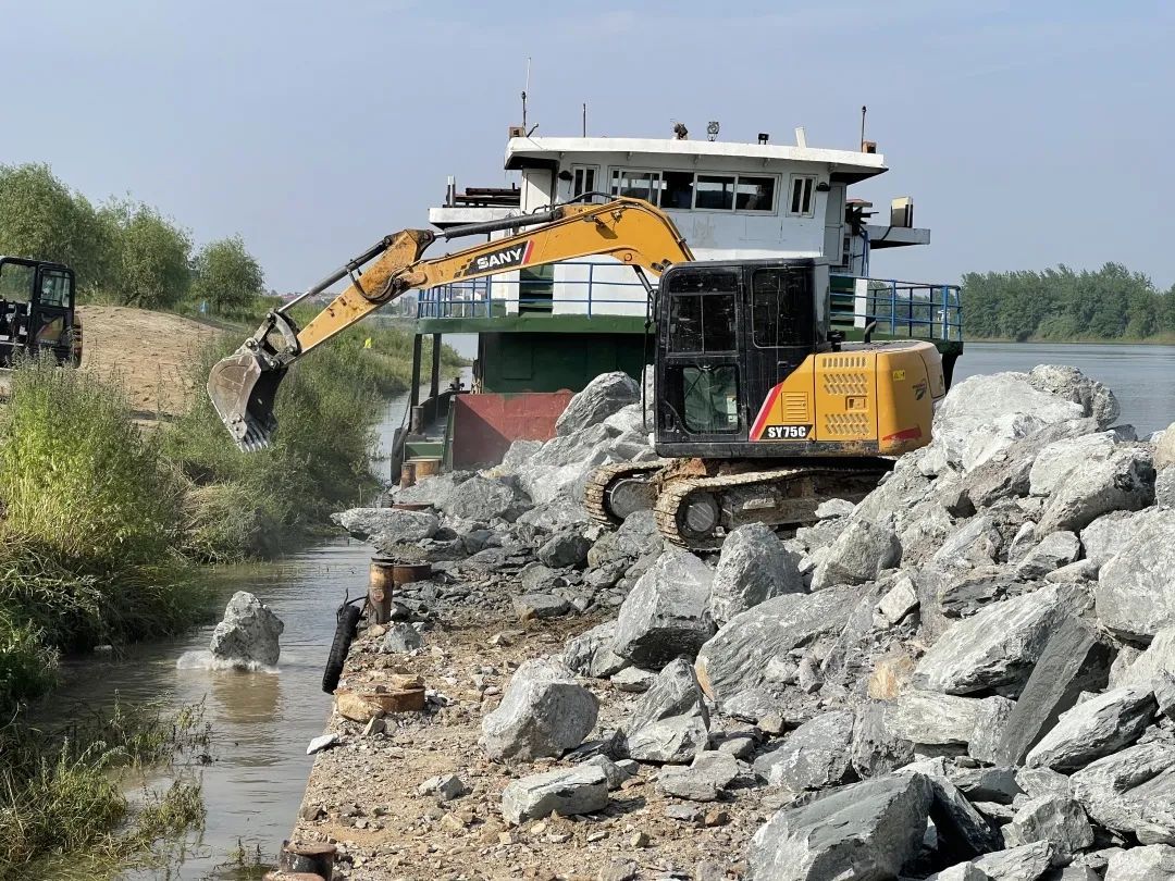 “根据当天水位情况和汛前检查情况,决定船的抛石位置,离岸边5米、10米、15米,然后向岸内抛。”现场监理王党生介绍,首先会选择密度较高的原材料,再进行定位抛石。每一台挖掘机配一条船,都有安全人员现场监督,上船人员必须要穿救生衣。