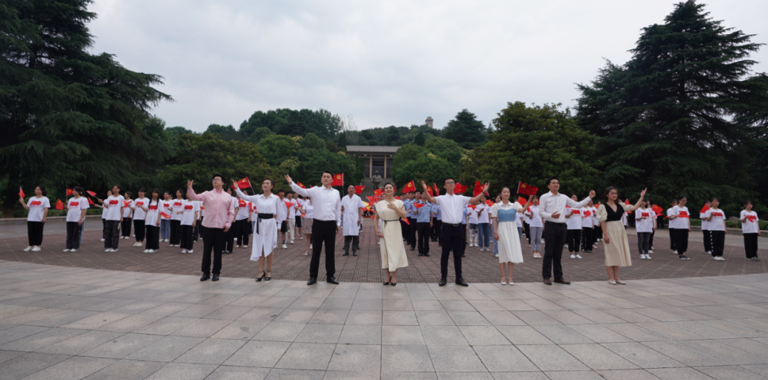 在省文联歌唱家的带领下,大悟县公安民警、消防救援指战员、医疗工作者、学生等组成的百人合唱团挥舞着手中鲜红的党旗,放声高歌。