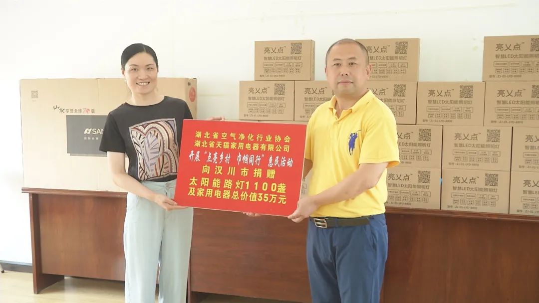 捐赠仪式上,湖北省空气净化行业协会、湖北天猫家用电器有限公司为韩集乡群建村捐赠了太阳能路灯1100盏及电视、音响、消毒柜、空气净化一体机等家用电器若干件,总价值35万元。