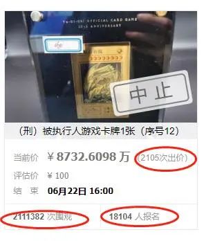 6月21日下午,一场司法拍卖登上微博热搜:评估价仅为100元的“青眼白龙金卡”,竞拍价格竟然突破了8700万元