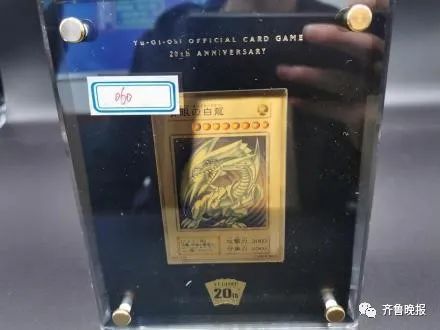 有业内人士表示,这是一张20周年纪念版“青眼白龙”游戏王纯金卡牌。游戏王卡牌是KONAMI公司开发的集换式卡牌游戏《游戏王卡片游戏》中所使用到的游戏纸牌,限量发售500套,每一张都有独特的印有“No.1——500”的收藏编号和证书,官方定价为1万多人民币。