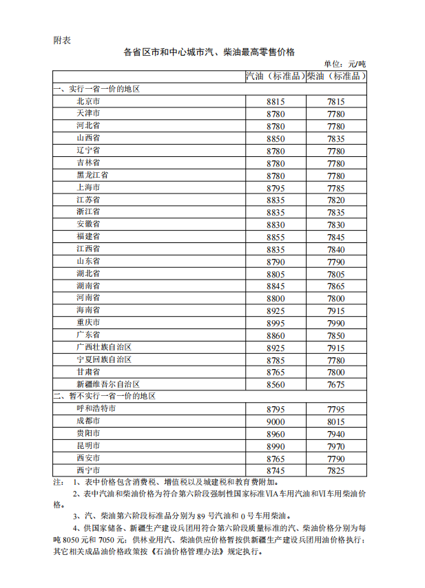 附:各省区市和中心城市汽、柴油最高零售价格